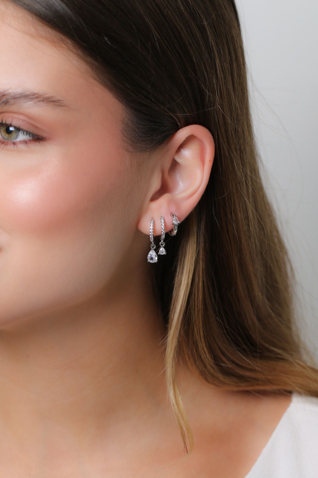 Brinco Trio Argola Cravejada e com Pontos de Luz Gota em Ródio Branco